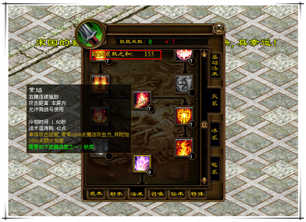 剩下的技能无需全学,选择几个凑点数,在保证火法终极技能“紫焰”学满7点的前提下,需基础技能加火系技能共155点。
