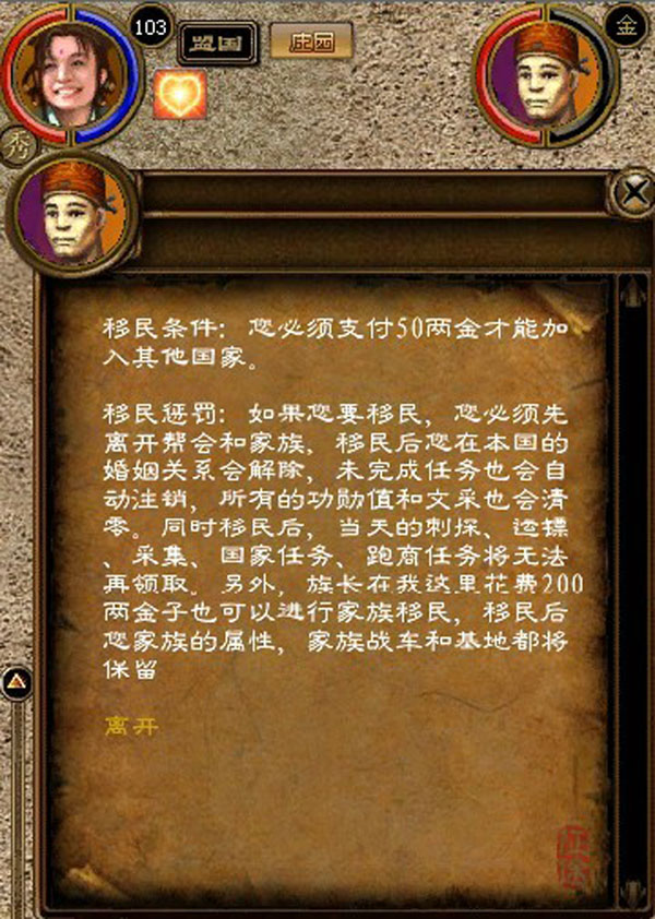 三、家族移民:有的玩家移民是为了建立新的联盟。不少对立国的玩家打着打着,打出感情来了。他们干脆抛弃原来的国度,果断私奔!他们一走往往携家带口的,好不容易升的家族基地啊,战车啊一个都不能少,统统打包带走。在移民官,族长花费200两金子可以进行家族移民,家族属性、基地、战车都将保留。值得注意的是,族长只能带走在线的家族成员。所以移民这样的大事家族内部先要商量好。